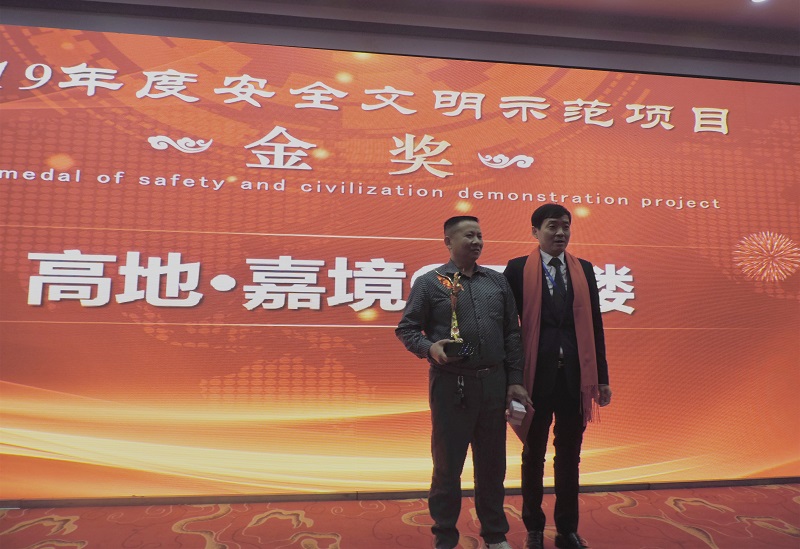 “2019年度安全文明示范項(xiàng)目金獎(jiǎng)”: “嘉魚?高地嘉境二期”;頒獎(jiǎng)人:集團(tuán)黨委書記、董事長馮義橋