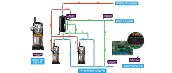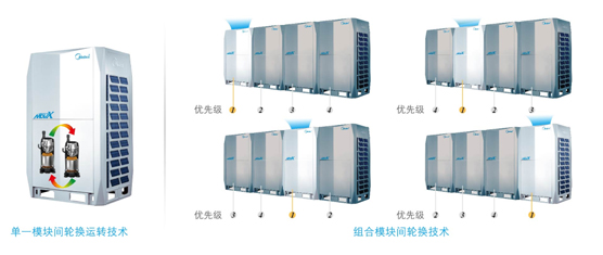 系統(tǒng)根據系統(tǒng)負荷情況,輪換設置優(yōu)先開啟的室外機模塊的壓縮機順序,平衡分配每臺室外機模塊的運行時間,大大提高了機組的可靠性和使用壽命。